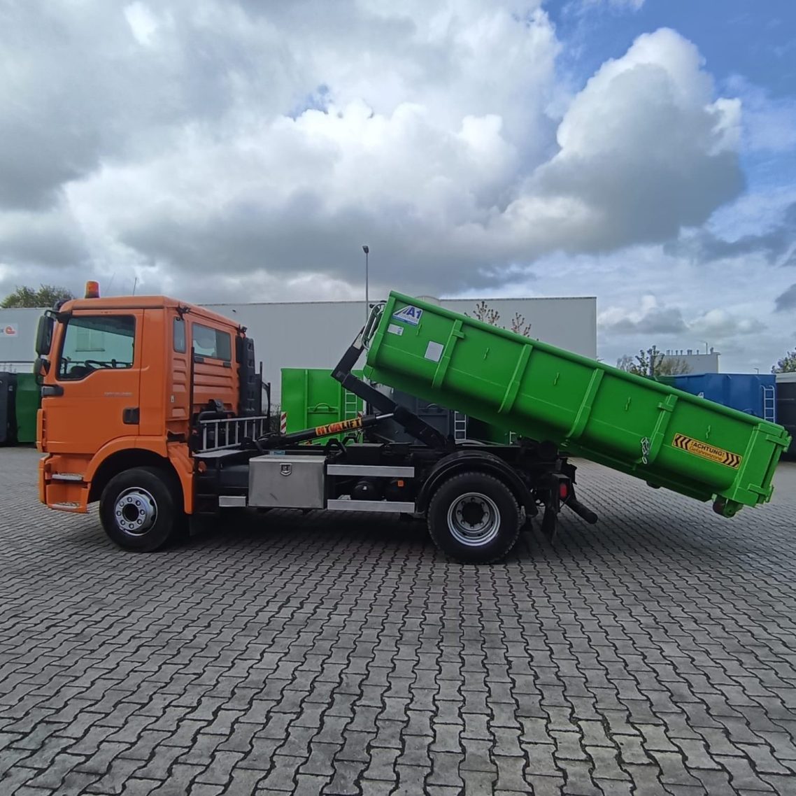 Dank des robusten Abrollsystems können wir verschiedene Containergrößen aufnehmen und exakt dort abstellen, wo sie gebraucht werden – ob im Vorgarten, auf engen Grundstücken oder in großen Außenanlagen. Das bedeutet: weniger manuelles Umfüllen, kürzere Wege und mehr Effizienz auf Ihrer Baustelle.